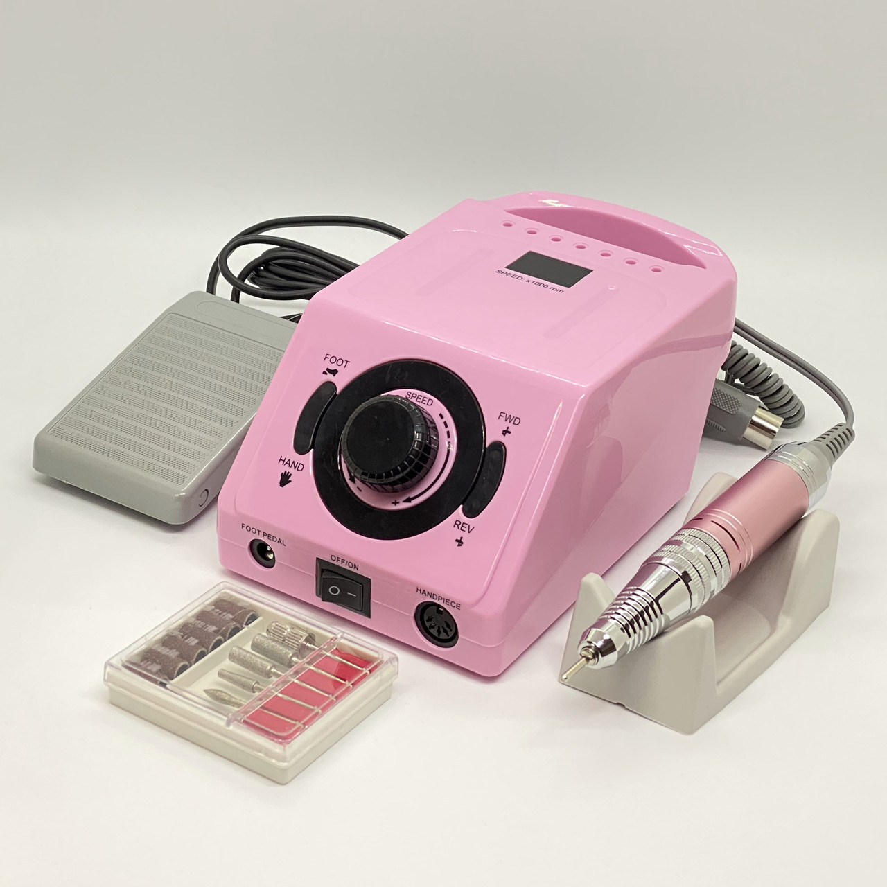 Також набір комплектується стандартним набором насадками, ножний педаллю управління і бічній пластиковою підставкою для ручки.